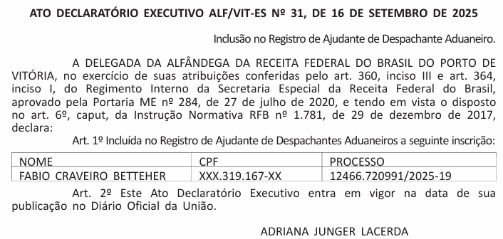 Inclusão no Registro de Ajudante de Despachante Aduaneiro.