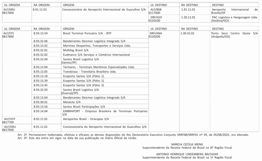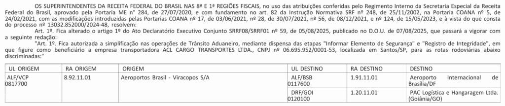 Altera o Ato Declaratório Executivo Conjunto SRRF08/SRRF01 nº 59, de 05/08/2025 – Simplificação nas operações de Trânsito Aduaneiro ao beneficiário ACL CARGO TRANSPORTES LTDA.