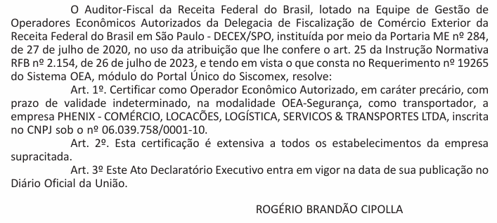 Certifica como Operador Econômico Autorizado a empresa que PHENIX – COMÉRCIO, LOCACÕES, LOGÍSTICA, SERVICOS & TRANSPORTES LTDA.