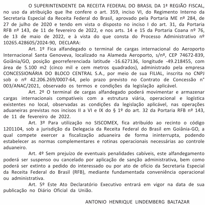 Declara alfandegado o TERMINAL DE CARGAS do Aeroporto Internacional Santa Genoveva, em Goiânia-GO, nos termos e condições normativos vigentes.