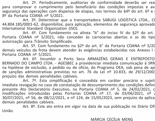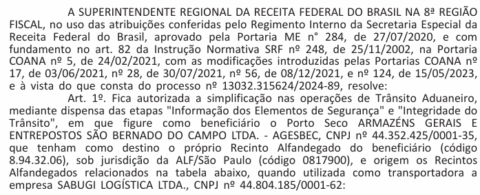 Autoriza a Simplificação de Operações de Trânsito Aduaneiro para o Depositário que menciona.