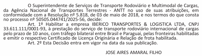 Habilitar empresa, à prestação do serviço de transporte rodoviário internacional de cargas pelo prazo de 10 anos, com tráfego bilateral entre Brasil e Paraguai.