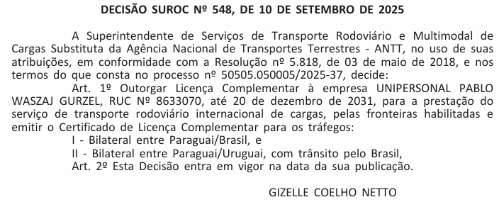 Outorgar Licença Complementar à empresa UNIPERSONAL PABLO WASZAJ GURZEL, RUC Nº 8633070, até 20 de dezembro de 2031, para a prestação do serviço de transporte rodoviário internacional de cargas.