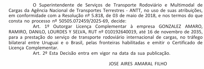 Outorgar Licença Complementar à empresa GONZALEZ AMARO, RAMIRO, DANILO, LOURDES Y SELVA, RUT nº 010192640019, até 16 de novembro de 2035, para a prestação do serviço de transporte rodoviário internacional de cargas, no tráfego bilateral entre Uruguai e o Brasil.