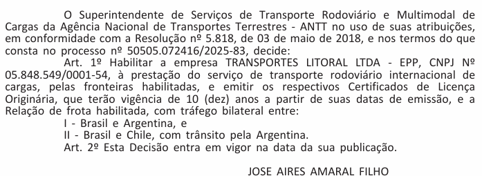 Habilitar a empresa TRANSPORTES LITORAL LTDA- EPP, CNPJ Nº 05.848.549/0001-54, à prestação do serviço de transporte rodoviário internacional de cargas, pelas fronteiras habilitadas: Brasil e Argentina, e Brasil e Chile.
