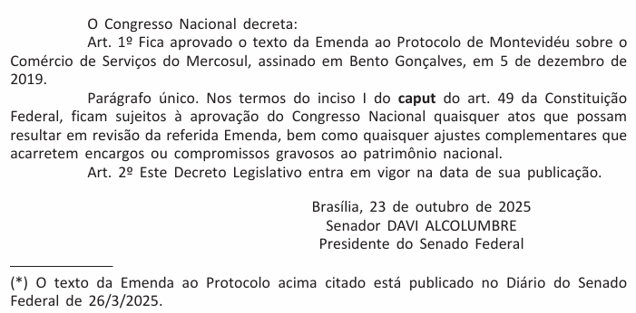 Aprova o texto da Emenda ao Protocolo de Montevidéu sobre o Comércio de Serviços do Mercosul, assinado em Bento Gonçalves, em 5 dedezembro de 2019.