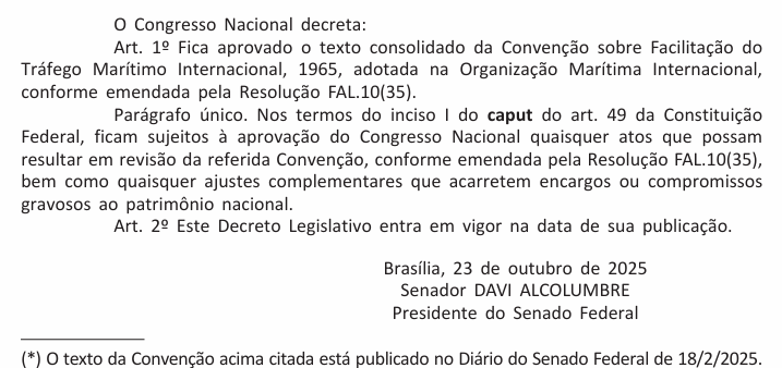 Aprova o texto consolidado da Convenção sobre Facilitação do Tráfego Marítimo Internacional, 1965, adotada na Organização Marítima Internacional, conforme emendada pela Resolução FAL.10(35).