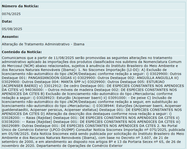 Comunicamos que a partir de 11/08/2025 serão promovidas as seguintes alterações no tratamento administrativo aplicado às importações dos produtos classificados nos subitens da Nomenclatura Comum do Mercosul (NCM) abaixo relacionados, sujeitos à anuência do Instituto Brasileiro do Meio Ambiente e dos Recursos Naturais Renováveis (Ibama):