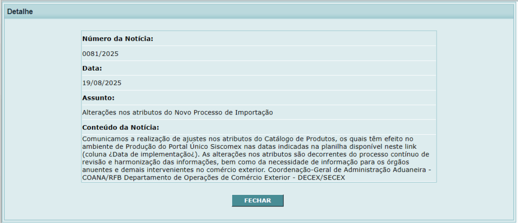 Comunicamos a realização de ajustes nos atributos do Catálogo de Produtos, os quais têm efeito no ambiente de Produção do Portal Único Siscomex nas datas indicadas na planilha disponível neste 𝗟𝗶𝗻𝗸 : https://www.gov.br/siscomex/pt-br/noticias/noticias-siscomex-importacao/Comunicados/Ajustes_de_atributos_em_producao_19082025.xlsx.