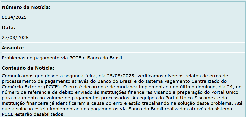 Comunicamos que desde a segunda-feira, dia 25/08/2025, verificamos diversos relatos de erros de processamento de pagamento através do Banco do Brasil e do sistema Pagamento Centralizado do Comércio Exterior (PCCE). O erro é decorrente de mudança implementada no último domingo, dia 24, no número da referência de débito enviado às instituições financeiras visando a preparação do Portal Único para o aumento no volume de pagamentos processados. As equipes do Portal Único Siscomex e da instituição financeira já identificaram a causa do erro e estão trabalhando na solução deste problema. Até que a solução esteja implementada os pagamentos via Banco do Brasil realizados através do sistema PCCE estarão desabilitados.