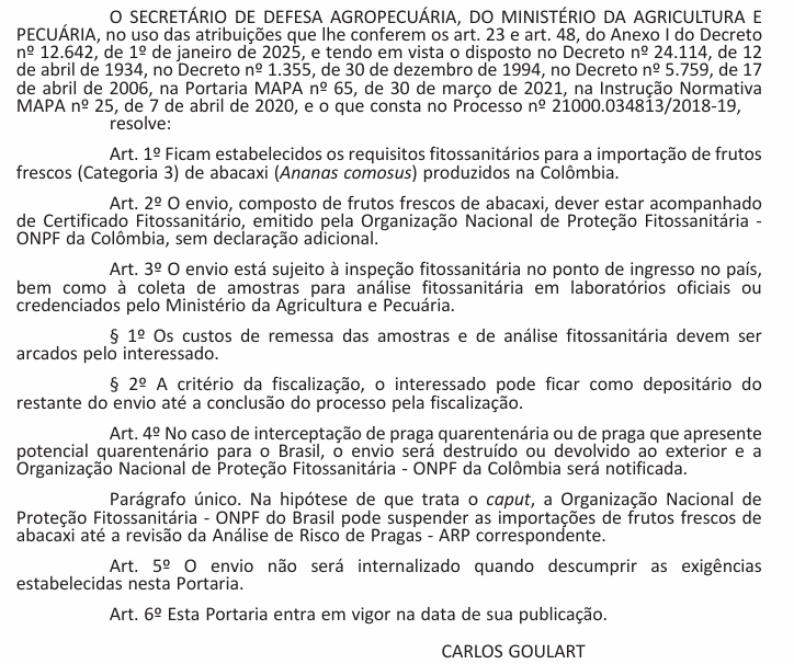 Estabelece os requisitos fitossanitários para a importação de frutos frescos de abacaxi (Ananas comosus) produzidos na Colômbia.