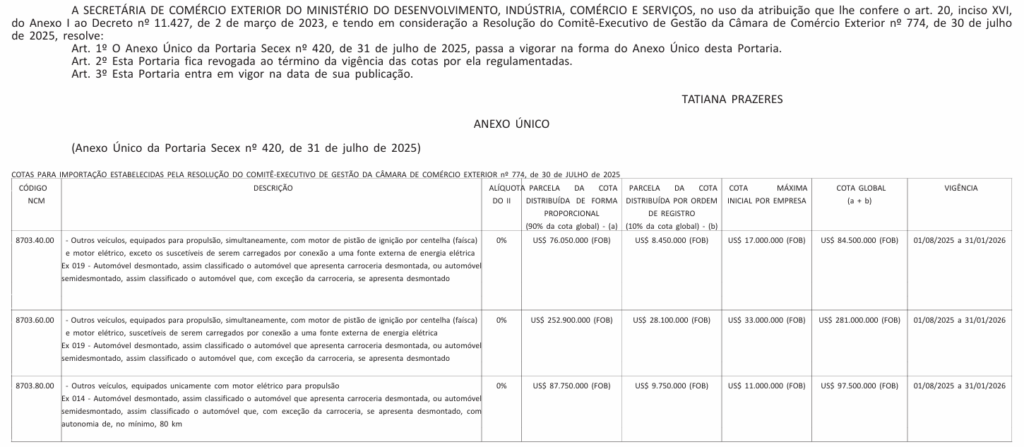 Altera o Anexo Único da Portaria Secex nº 420, de 31 de julho de 2025.