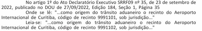Código de Recinto do Aeroporto Internacional de Curitiba como origem de de Trânsito Aduaneiro