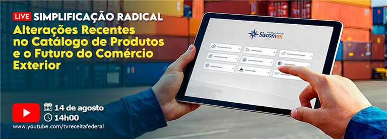 A Receita Federal convida toda a comunidade aduaneira, servidores e cidadãos interessados para a live “Simplificação Radical: alterações recentes no catálogo de produtos e o futuro do comércio exterior”, que será transmitida no dia 14 de agosto, às 14h, pelo canal oficial da Receita Federal no YouTube.